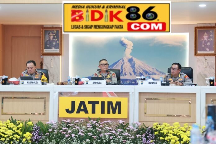 Bidik86.com || SURABAYA – Polda Jawa Timur kembali menggelar Analisa dan evaluasi (Anev) Sitkamtibmas 2024 dan hasil Operasi Lilin Semeru 2024 – 2025 di Rupatama Mapolda Jatim, Jumat (24/1/2025).