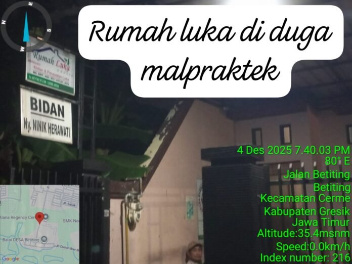 Bidik86.com || Gresik – Dugaan malpraktik kembali mencuat di sebuah rumah luka milik seorang perawat berinisial O (dikenal warga sebagai Otek) yang beroperasi di Desa Betiting, Kecamatan Cerme, Kabupaten Gresik. Seorang pasien bernama Sukesih, warga Desa Cerme Kidul, meninggal dunia setelah sebelumnya mengalami infeksi berat usai menjalani perawatan luka tanpa izin.
