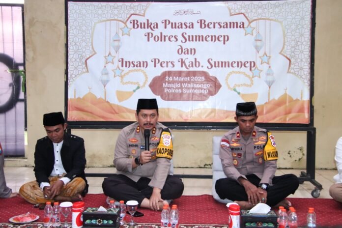 SUMENEP – Bidik86.com || Dalam rangka mempererat silaturahmi di bulan suci Ramadhan, Kapolres Sumenep AKBP Henri Noveri Santoso didampingi Wakapolres serta Pejabat Utama (PJU) Polres Sumenep Polda Jatim menggelar acara buka puasa bersama dengan insan pers, Senin (24/3/2025).