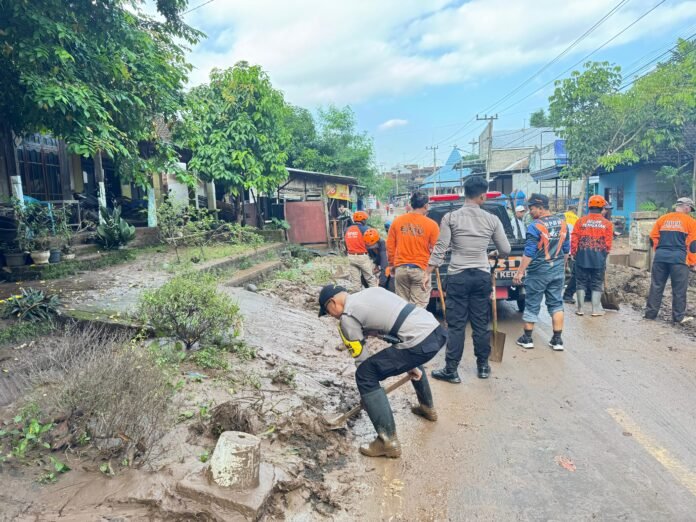 Petugas gabungan antara Polres Kediri Kota, BPBD Kab. Kediri, PMK Kab. Kediri dan Kodim 0809 Kediri untuk membersihan lumpur di Jl. Desa Tiron dan beberapa rumah warga.