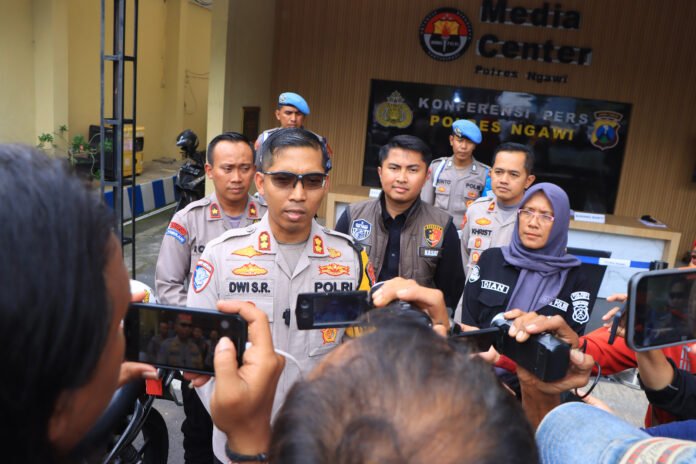 NGAWI – Bidik86.com || Kapolres Ngawi AKBP Dwi Sumrahadi Rakhmanto, S.H., S.I.K., M.H., didampingi Wakapolres Kompol Achmad Robial, S.E., S.I.K., M.H., dan sejumlah pejabat utama Polres Ngawi melaksanakan press release akhir tahun 2024, di depan Media Center Polres Ngawi.
