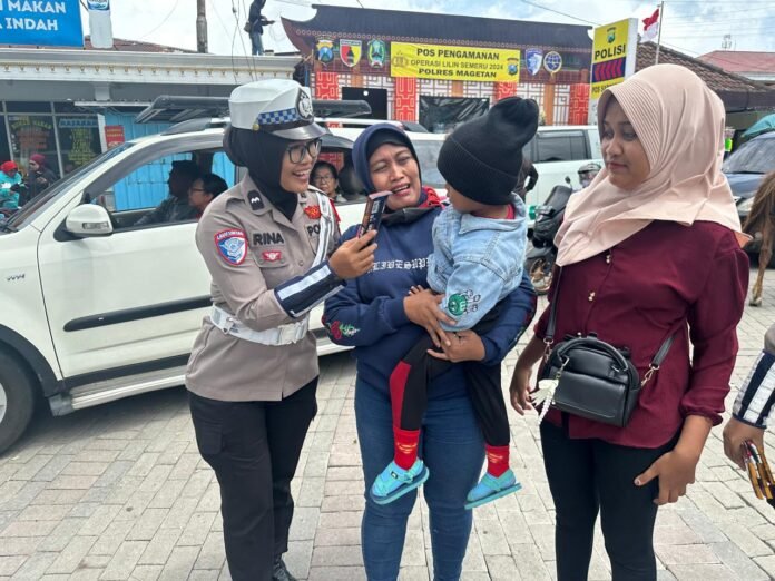 Dalam kegiatan ini, petugas memberikan himbauan Kamtibmas kepada pengunjung sekaligus membagikan coklat kepada anak-anak, menciptakan suasana yang akrab dan menyenangkan di kawasan wisata.
