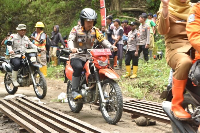 Di Desa Wonoboyo AKBP Harto Agung Cahyono bersama rombongan Forum Koordinasi Pimpinan Daerah (Forkopimda) menuju lokasi dengan menggunakan roda dua karena jalur menuju ke lokasi desa Wonoboyo mengalami kerusakan.