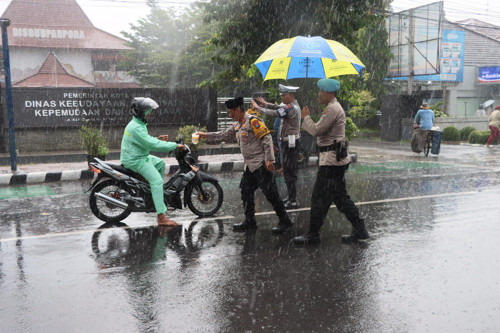 Meski di bawah guyuran air hujan, namun dengan rasa kepedulian dan dedikasi tinggi personel Polres kediri kota tetap melaksanakan bagi takjil di bulan ramadhan.