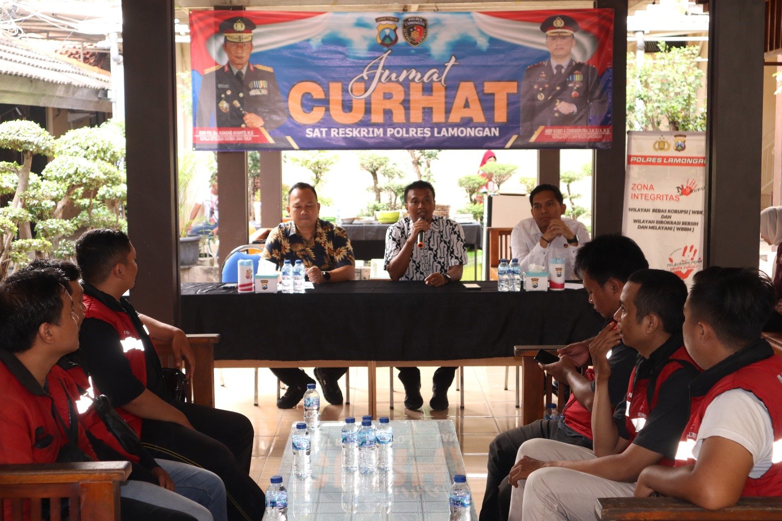LAMONGAN – Bidik86.com || Dalam rangka mendekatkan diri dengan masyarakat serta mendengar langsung keluhan dan masukan dari para pelaku jasa layanan antar, Satuan Reserse Kriminal (Satreskrim) Polres Lamongan Polda Jatim menggelar kegiatan Jumat Curhat bersama Komunitas Delivery Order.