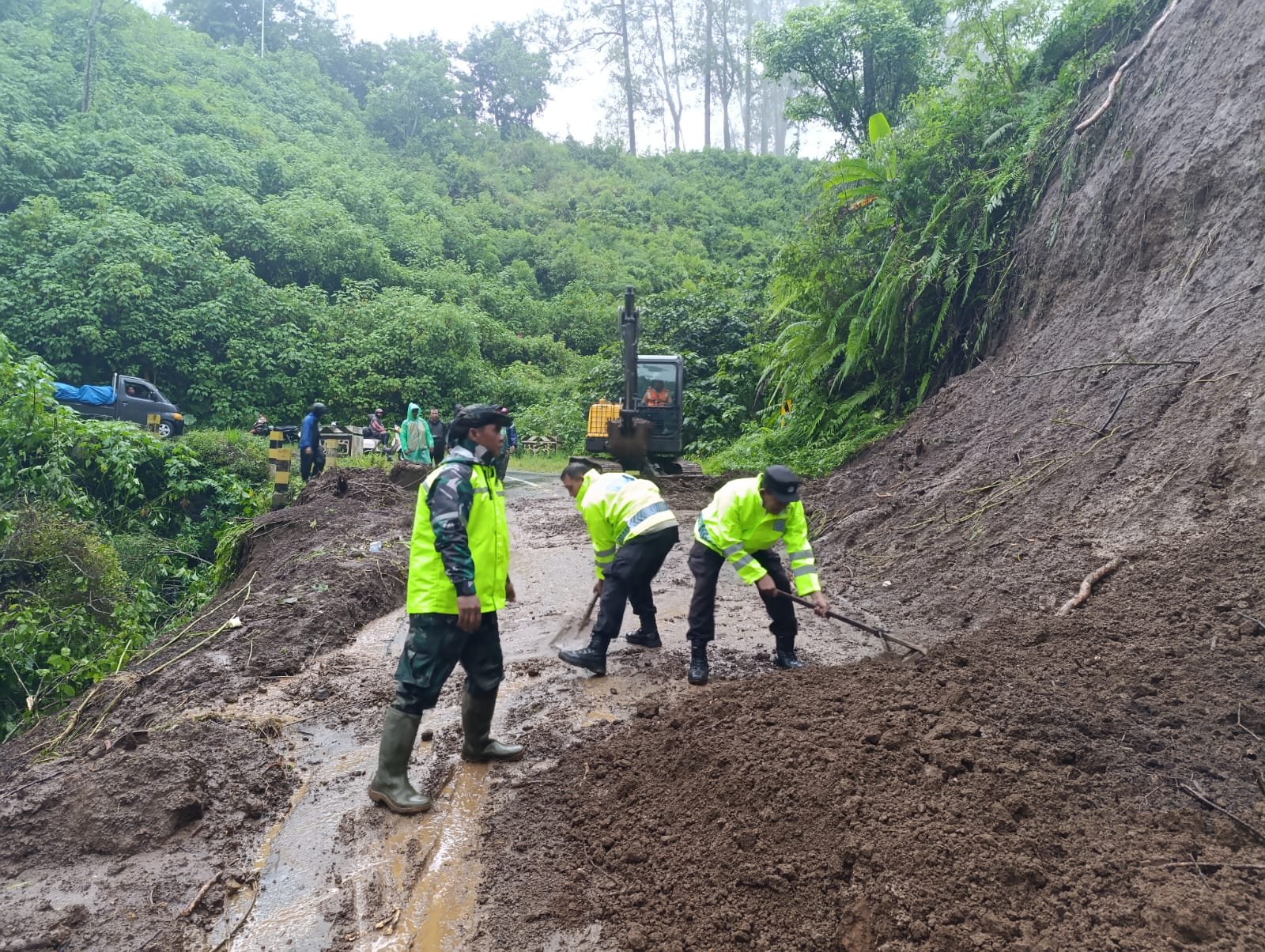 Longsor terjadi setelah hujan deras mengguyur kawasan tersebut sejak dini hari, mengakibatkan material tanah dan pohon tumbang menutup jalan dengan ketinggian mencapai 13 meter dan ketebalan 3 meter.