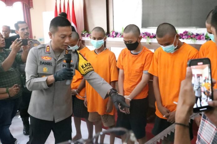 “Tersangka berinisial IN (18), PR (18), PTR (18), FR (19), NV (18), GL (16) masih di bawah umur dan AZ masih DPO,” ujar AKP Siko Sesaria Putra Suma yang juga didampingi Kasihumas Ipda Slamet Hariyono.