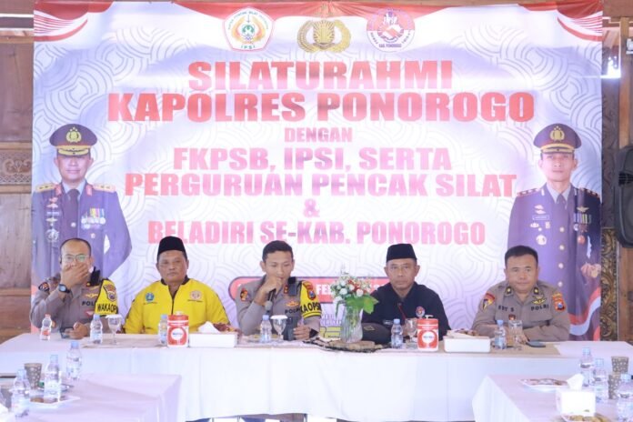 PONOROGO – Bidik86.com || Polres Ponorogo Polda Jatim menggelar silaturahmi dengan Forum Komunikasi Pencak Silat dan Bela Diri (FKPSB), Ikatan Pencak Silat Indonesia (IPSI), serta para ketua perguruan pencak silat dan bela diri se-Kabupaten Ponorogo Jawa Timur.